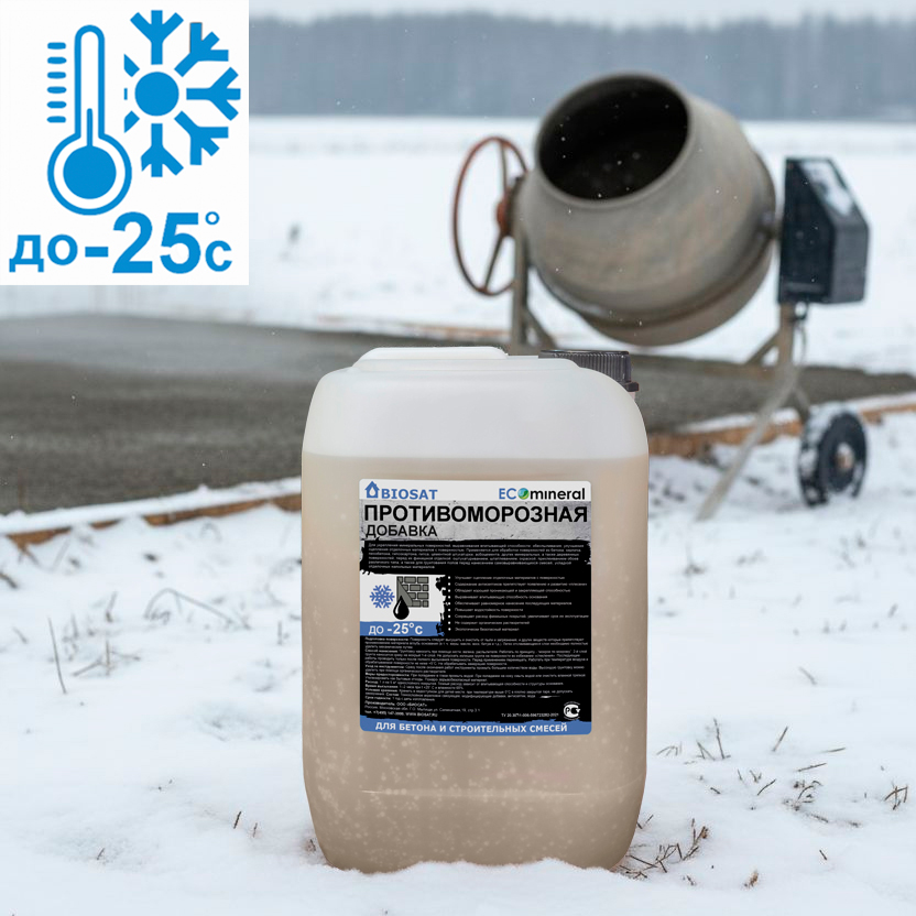Механизм действия. Противоморозная добавка БИОСАТ снижает температуру замерзания воды в цементном растворе, предотвращая образование кристаллов льда и сохраняя непрерывное протекание гидратационных процессов, приводящих к полноценному затвердеванию и набору прочности растворов на холоде. Пластифицирующие компоненты рецептуры улучшают реологические свойства цементной смеси, существенно увеличивая конечную прочность материала.